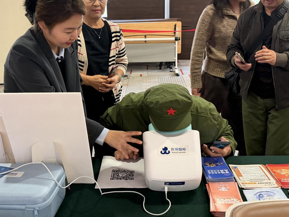 活动现场,泰康志愿者们设置“中医AI目诊仪”为长者们提供非接触式眼部健康筛查服务。通过科技手段模拟传统中医的“望诊”环节,快速生成初步健康评估报告,并由专业人员给予个性化健康建议,让长者们感受到新时代智慧养老的温度与便利。